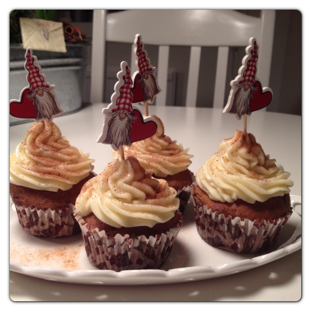 Till annandagens fika blev det pepparkaksmuffins med vit chokladfrosting, några stänk av kanel och en tomte på toppen. Receptet är från COOP. Frostingen är en annan än den i receptet, lika delar smält vit choklad och Philadelphia som blandas.