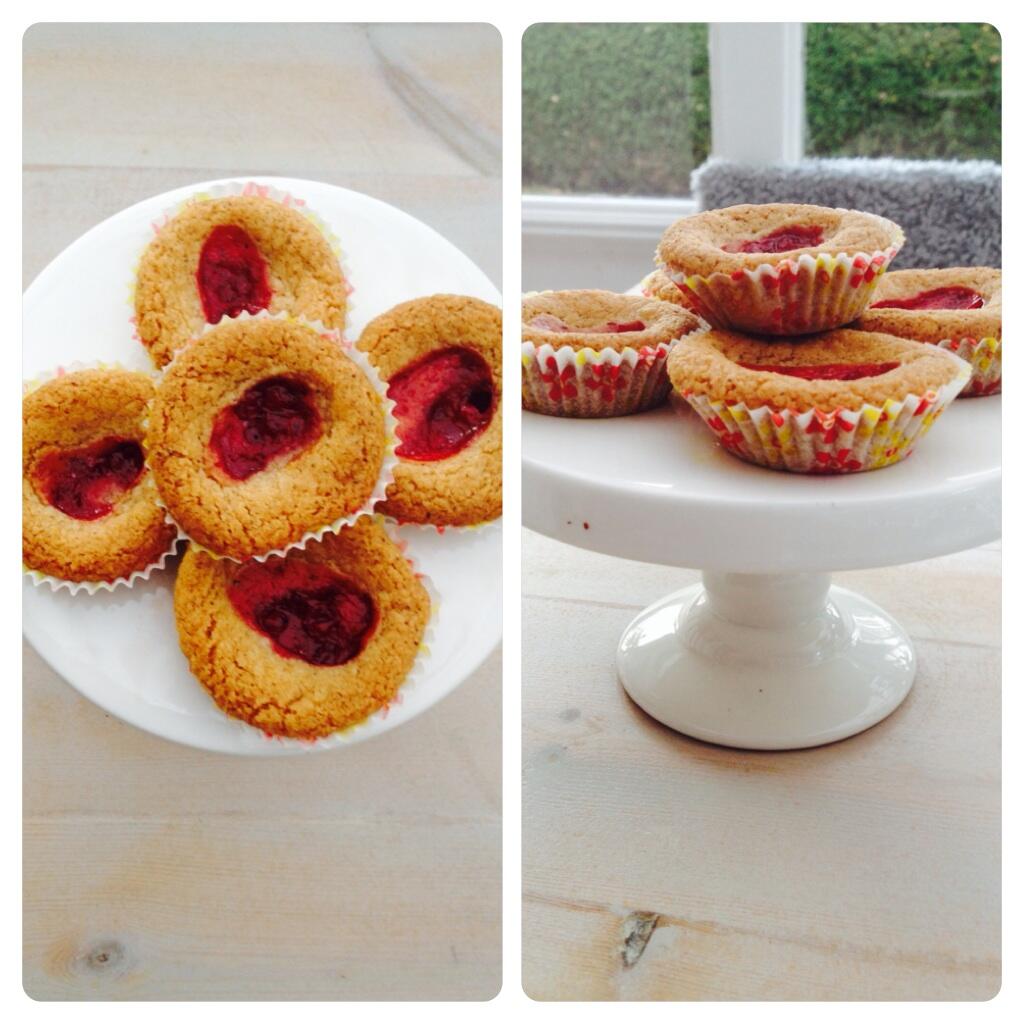 Rulla degen till längder och skär dem i 50 bitar. Rulla bitarna till kulor och lägg dem i formarna. Gör en fördjupning mitt i varje kaka och fyll på med en klick sylt. Grädda kakorna i mitten av ugnen i cirka 12 minuter.